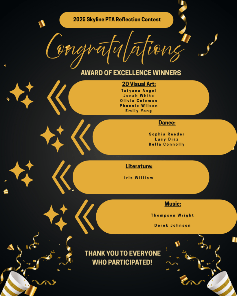 There are many activities that PTSA will be involved with this year at Skyline: Reflections, Dances, Hospitality, Teacher Appreciation, and so much more. We hope you will have an opportunity to get involved! If you are interested in donating to Skyline PTSA click on this link. You can select where you want your donation to go, if you would like.